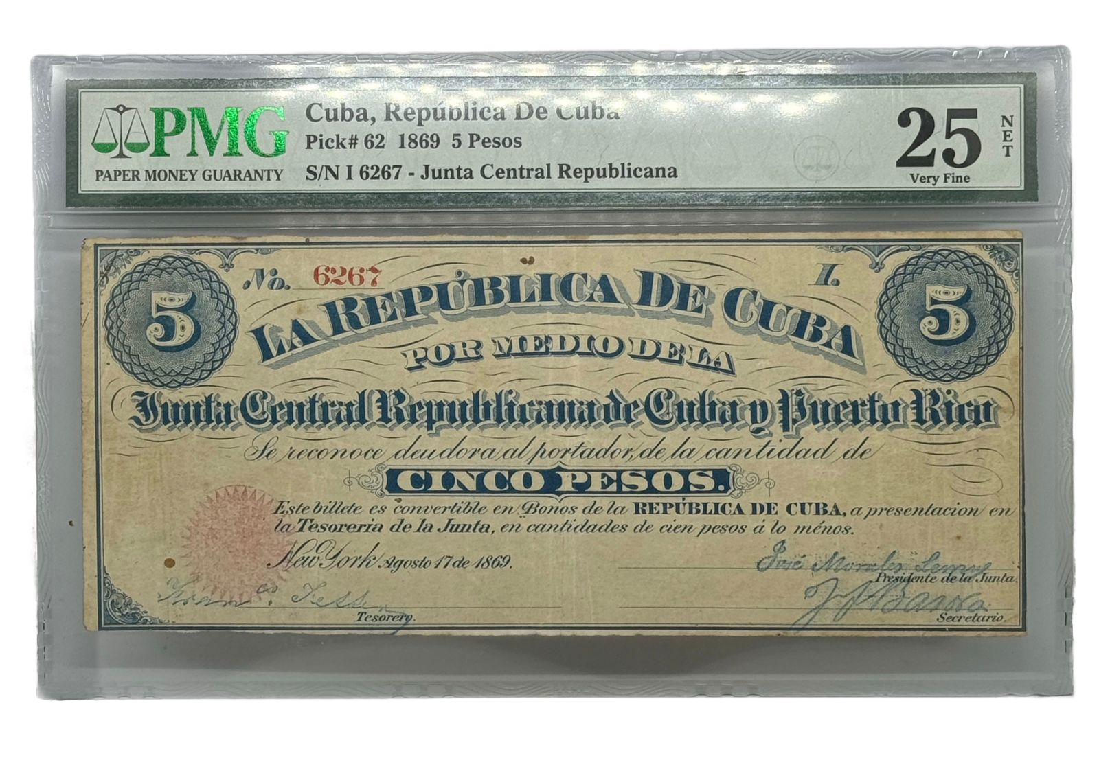 5 Pesos 1869 Cuba, República de Cuba PMG 25VF