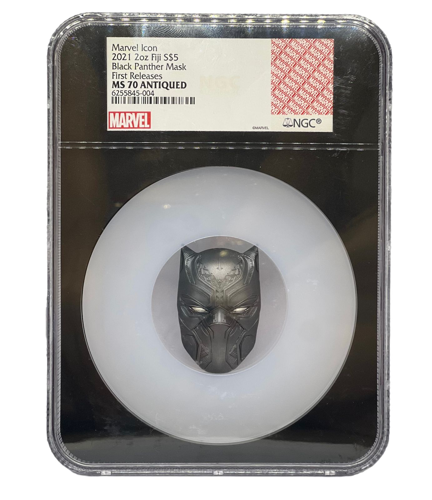 Moneda icono de Marvel de la mascara de la pantera negra 2oz Fiji Plata 5$ 2021. First Releases